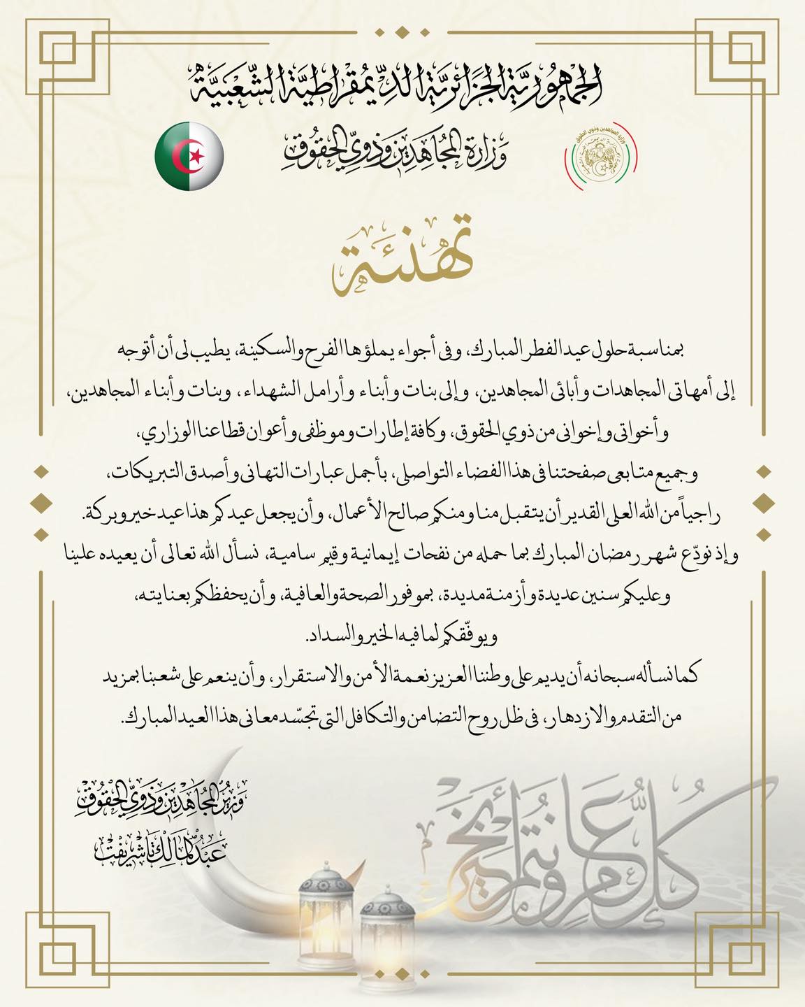Accueilتهنئةالسيد وزير المجاهدين وذوي الحقوق يوجه تهانيه بمناسبة حلول عيد الفطر المبارك تهنئة السيد وزير المجاهدين وذوي الحقوق يوجه تهانيه بمناسبة حلول عيد الفطر المبارك 0 15 مارس 20, 2026 كتب بواسطة pmgov pmgov Partager FacebookX Partager FacebookX Article précédentوزير المجاهدين وذوي الحقوق يشارك في جلسة بالمجلس الشعبي الوطني للتصويت على مشاريع قوانين بينها تجريم الاستعمار الفرنسيArticle suivantوزير المجاهدين عبد المالك تاشريفت يصل إلى قسنطينة لإحياء ذكرى استشهاد مصطفى بن بولعيد pmgov pmgovhttps://mmad.gov.dz مقالات ذات صلة تهنئة وزير المجاهدين وذوي الحقوق يزور عبد الحق بن بولعيد بالمستشفى المركزي للجيش بعين النعجة مارس 2, 2026 LAISSER UN COMMENTAIRE Commenter : S'il vous plaît entrez votre commentaire! Nom : S'il vous plaît entrez votre nom ici Email : Vous avez entré une adresse email incorrecte! Veuillez entrer votre adresse email ici Site : Enregistrer mon nom, email et site web dans ce navigateur pour la prochaine fois que je commenterai. المنصة الرقمية للشهادات الحية شاهــــد 54 إعلانـــــــــــــــــات الأكثر شهرة تعزيز التعاون الجزائري الصيني: وزير المجاهدين وذوي الحقوق يستقبل سفير الصين بالجزائر أبريل 2, 2026 الكلمة التأبينية التي ألقاها وزير المجاهدين وذوي الحقوق البروفيسور عبد المالك تاشريفت خلال مراسم تشييع رئيس الجمهورية الأسبق المجاهد اليامين زروال بمقبرة بوزوران بولاية... مارس 30, 2026 وزير المجاهدين وذوي الحقوق البروفيسور عبد المالك تاشريفت يلقي النظرة الأخيرة على جثمان رئيس الجمهورية الأسبق، المجاهد السيد اليمين زروال، بقصر الشعب مترحّمًا على... مارس 30, 2026 وفاة الرئيس الأسبق والمجاهد اليامين زروال: الجزائر تفقد رمزاً وطنياً بارزاً مارس 29, 2026 Voir plus احدث التعليقات A WordPress Commenter sur وزير المجاهدين وذوي الحقوق يشرف على افتتاح ندوة تاريخية بمناسبة الذكرى المزدوجة لتأسيس الاتحاد العام للعمال الجزائريين وتأميم المحروقات